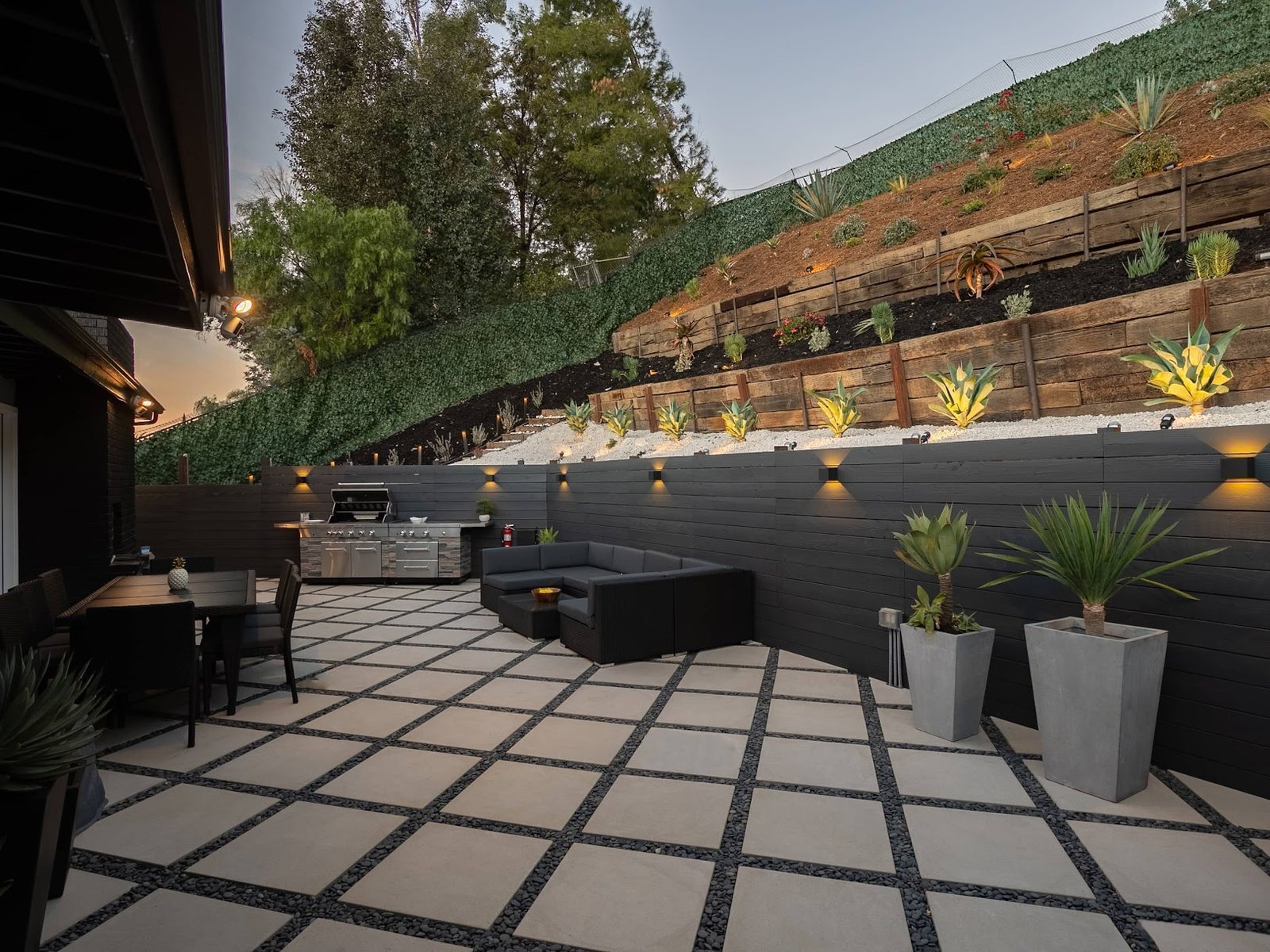 מטבח חוץ מושלם – מאובזר עם גריל מקצועי, משטחי עבודה מרווחים ופינת אוכל חיצונית לארוחות באוויר הפתוח.